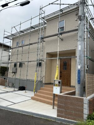 今回足場工事を担当したのは、千葉県船橋市にある2階建ての木造戸建て住宅です。住宅は比較的コンパクトな敷地に建っており、左右には隣接する住宅があるため、足場の組立スペースが限られていました。このような狭小地での作業では、資材の搬入・搬出や作業員の動線確保に工夫が求められます。