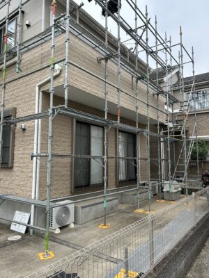 今回の現場は、埼玉県ふじみ野市の閑静な住宅街に位置する2階建ての木造住宅でした。建物は比較的新しく、住宅が密集した地域にあるため、敷地面積が限られており、両隣の住宅とはわずかな距離しかありませんでした。足場を設置するスペースを十分に確保することが難しく、慎重な計画と細かな調整が必要でした。